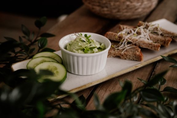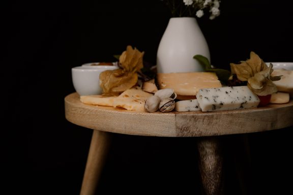 Wurst- und Käseplatte, hausgemachter Quiche, herzhaften Blätterteigtaschen, kleinen süßen Köstlichkeiten und einem hausgemachtem Dessert.